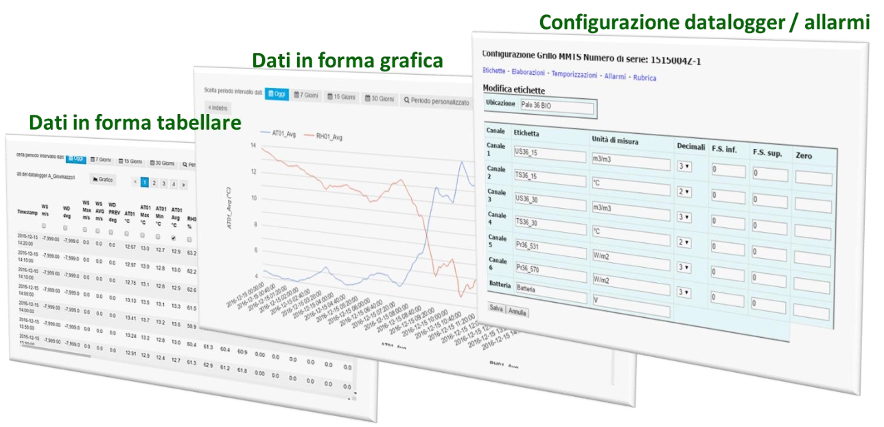 OLINDA permette di visualizzare in tempo reale tutti i dati registrati dal datalogger sia in formato tabellare che in forma grafica, scegliendo l’intervallo temporale di interesse tra quelli predefiniti o selezionandone uno personalizzato. Inoltre è possibile modificare la configurazione dei datalogger e visualizzare l’ultima misura disponibile (per i datalogger della serie Grillo). La trasmissione dei dati registrati, può avvenire utilizzando sia una SIM-card di nostra proprietà, che una di proprietà del Cliente.